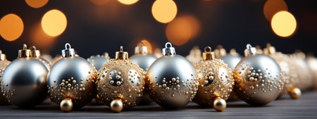 New Year and Christmas magic elegant background, golden shiny Christmas balls in a row on light background of Christmas lights, new year 2024, luxury style, with copy space
