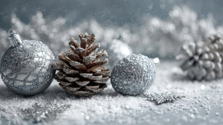 A captivating arrangement of elegant silver Christmas ornaments and natural pinecones set against a snowy backdrop, perfect for festive decor.