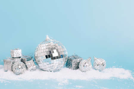 Christmas toy disco ball slugs on pastel blue background, snow sparkles, confetti. Christmas or New Year mockup concept