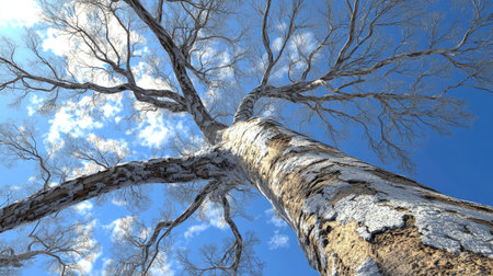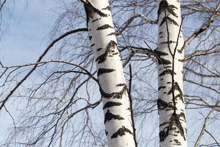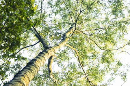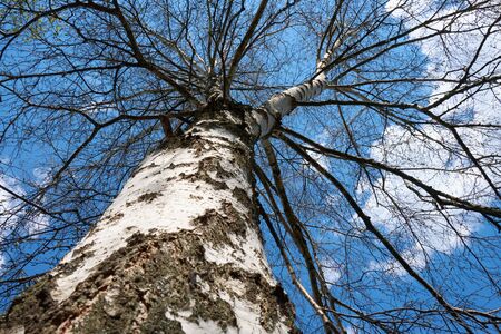 Bottom view of birch in sunlight in the spring morning. Close-up