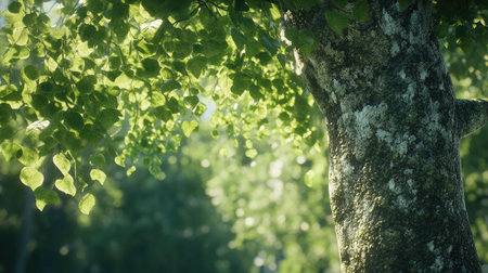 The Poplar bark in spring, fresh green leaves, soft sunlight filtering, vibrant atmosphere full of vitality, natural textures, serene mood.