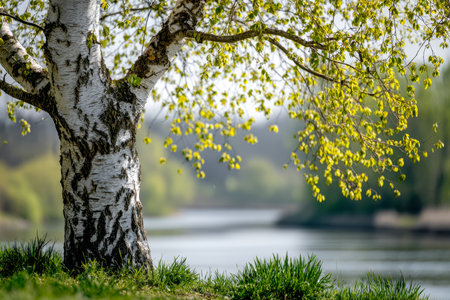 A serene lakeside view featuring vibrant spring foliage, a luminous birch tree, and gentle ripples under a soothing daylight in a quiet natural landscape.
