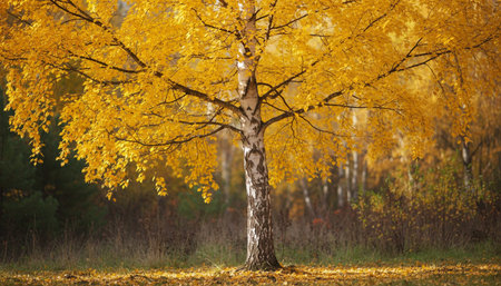 Tall bitch tree with golden yellow leaves against clear blue sky on a sunny day. Autumn colors. Natural pattern, texture, background, wallpaper. Nature, seasons. Panoramic image