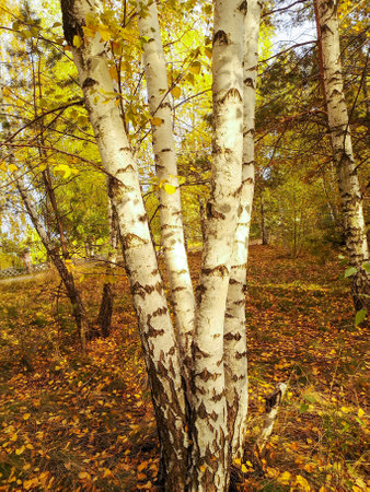Beautiful birch in yellow autumn birch forest in October among other birches in birch grove