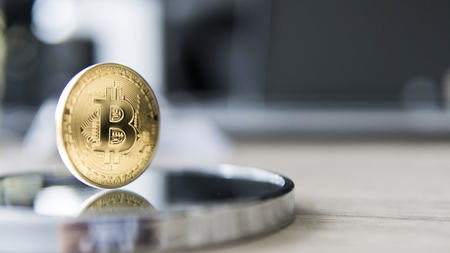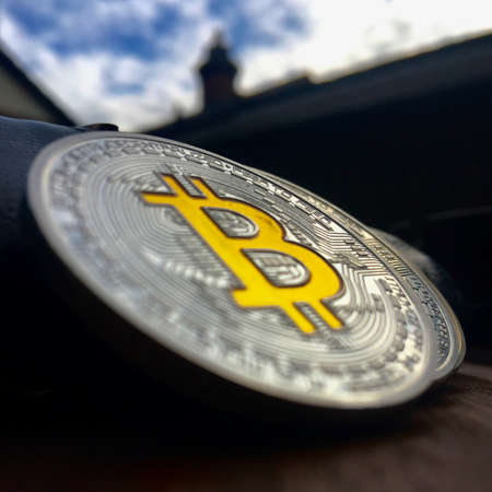 Digital currency physical metal bitcoin coin. Virtual cash concept.