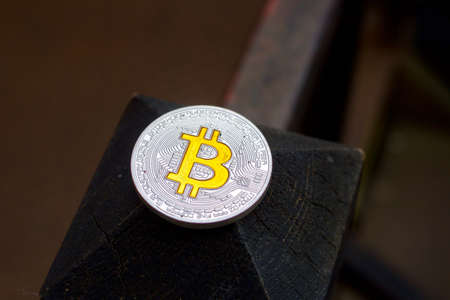 Cryptocurrency physical silver bitcoin coin with yellow sign on the wood.
