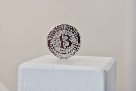 Silver bitcoin on the table. Symbol of crypto currency. Virtual currency. BTC.