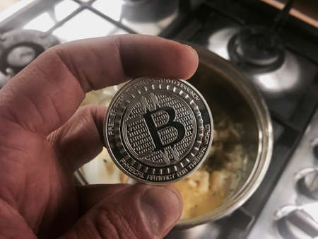 Crypto currency physical metal silver bitcoin coin in hand near the kitchen.