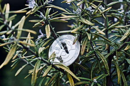 Digital currency physical megtal silver bitcoin coin. Cryptocurrency plant concept.