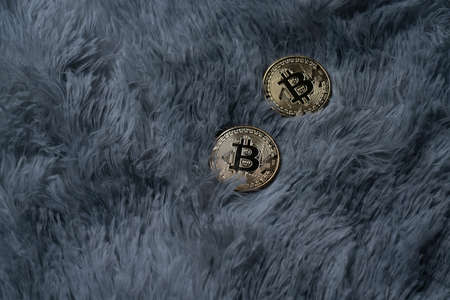 Digital currency physical metal bitcoin coin on the gold bitcoins. Gold money concept.