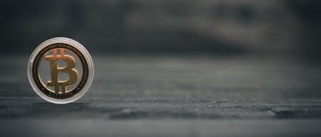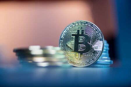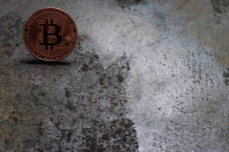 Digital currency physical metal bitcoin coin. Cryptocurrency business concept.