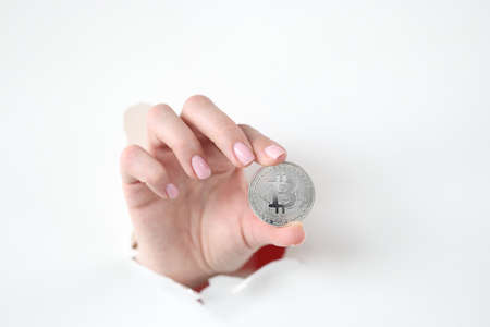 Bitcoin coin is held by hand through hole in white paper