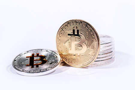 Silver and golden bitcoins over white background