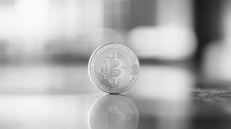 Silver bitcoin standing on a reflective surface, representing investment in cryptocurrency and the future of finance in a blurred background