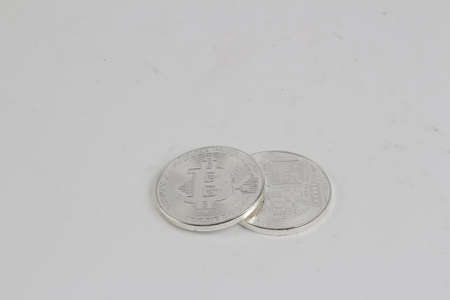 Cryptocurrency physical silver bitcoin coin with yellow sign