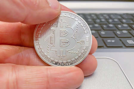 Cryptocurrency physical silver bitcoin coin holding in man fingers.