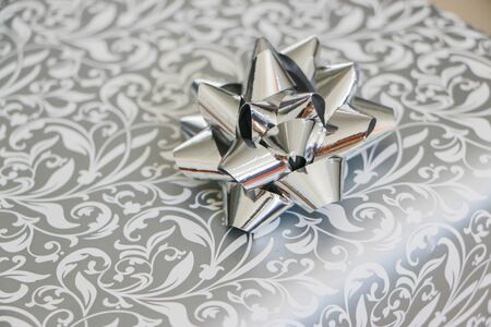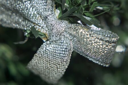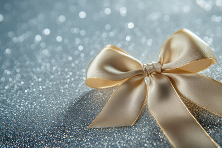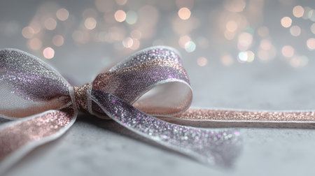 Close-up image of a sparkling silver ribbon tied on a gift package. The soft depth of field enhances the festive realism, highlighting the ribbon's intricate details.