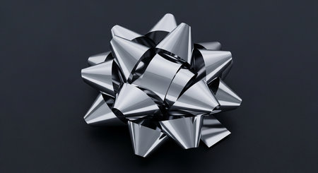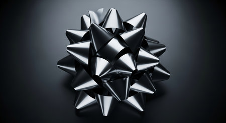 A shiny metallic silver starburst bow sits on a dark, reflective surface with dramatic lighting.