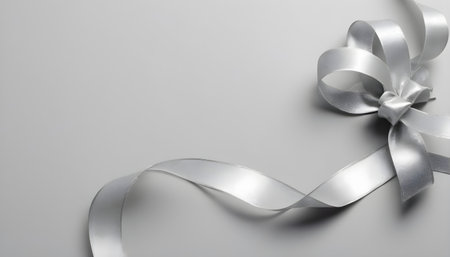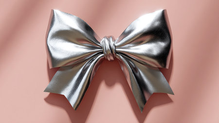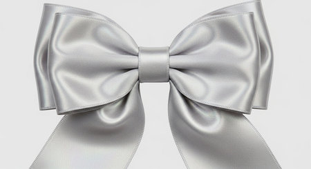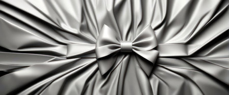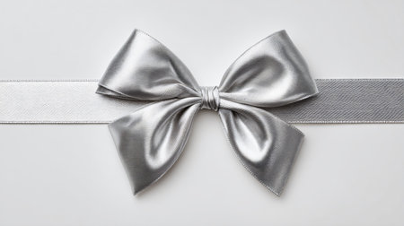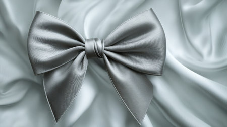 Elegant silver ribbon bow rests on a smooth satin fabric, creating a luxurious aesthetic perfect for gift wrapping or enhancing decor for special occasions.