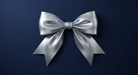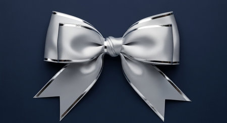 A shiny silver ribbon bow is centered against a dark blue background with soft lighting.