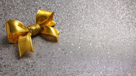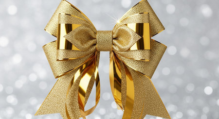 A stunning golden bow rests atop a shimmering silver background, perfect for adding a touch of elegance to any gift. Ideal for special occasions and celebrations.