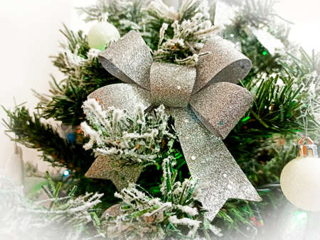 Silver satin bow tied on ribbon with glitter and snowflakes for holidays