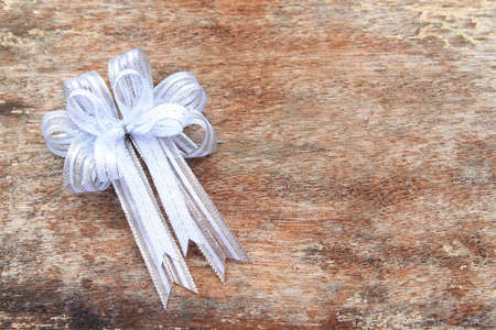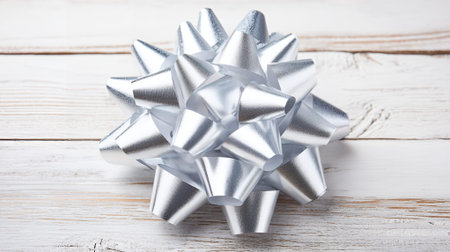 A close-up shot of a shiny silver gift bow placed on a weathered, light-colored wooden surface.