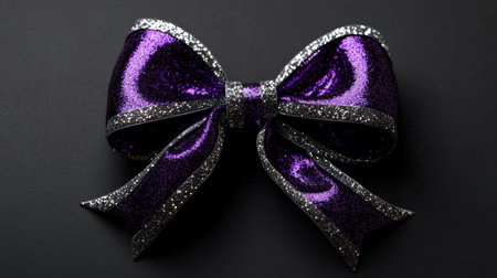 A captivating shiny purple glitter bow with silver trim set against a dark background, ideal for enhancing crafts, gifts, and festive decorations.