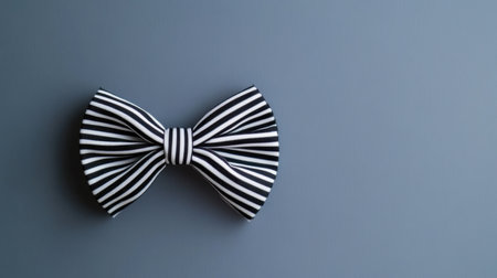 A striking black and white striped bow tie elegantly laid flat on a soft gray background, perfect for showcasing fashion accessories and formal attire.