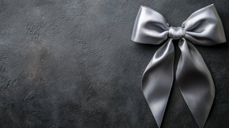 An elegant silver satin bow rests against a dark, textured background, perfect for enhancing gift presentations, decorations, or stylish occasions.