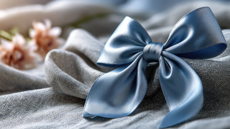 A beautiful blue satin bow is elegantly placed on soft fabric, accompanied by delicate floral elements in the background. Perfect for decorative purposes.