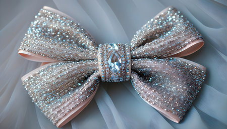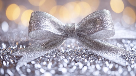 A beautiful silver bow adorned with sparkles sits elegantly on a glittery background, perfect for festive decorations or gift presentations.