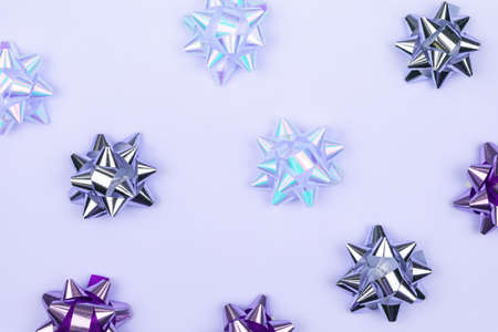 Christmas or new year composition with various silver decorations on a lilac background. Space for text.