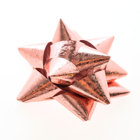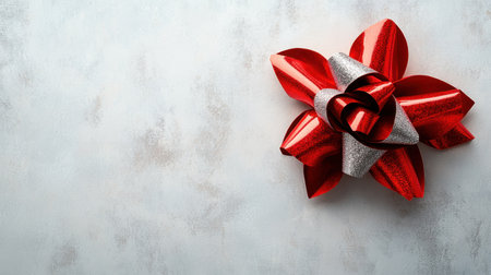 A single bright red holiday bow with a gray sheen, arranged in a flat lay style on a clean white surface, showcasing its four elegant loops.