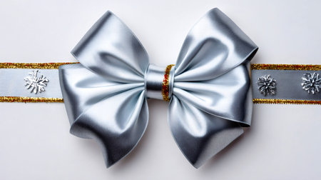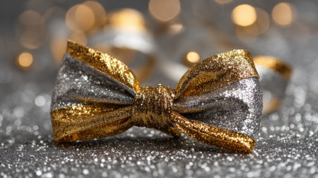This image features a shiny glittery bow tie decoration in silver and gold, set against a soft bokeh background, perfect for festive occasions and celebrations.