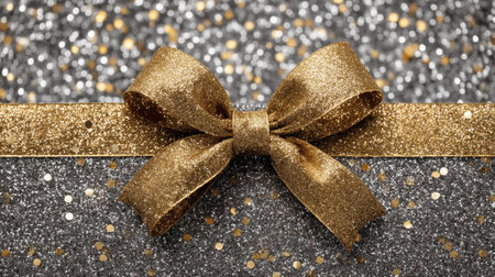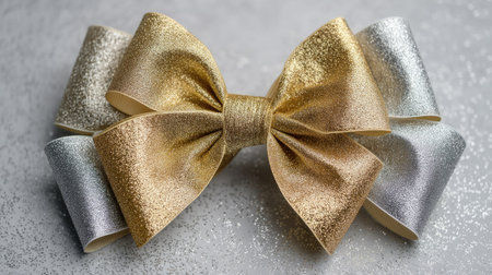 Beautiful glitter bow in gold and silver hues, set against a grey surface. Perfect for decorations, gift wrapping, and adding a touch of elegance to any occasion.