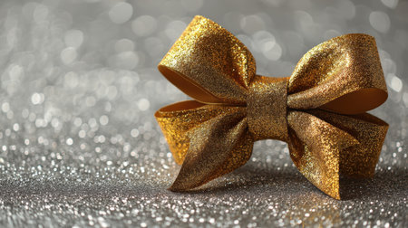 A beautiful gold bow decoration surrounded by a sparkling silver background. Perfect for festive celebrations, gift wrapping ideas, or as a stylish holiday accessory.