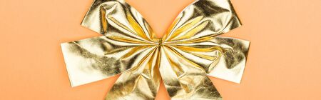 top view of golden shiny decorative bow on orange background, panoramic shot