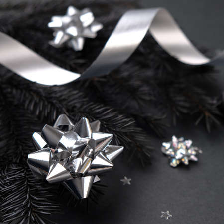 Square shape present wrapped in silver paper, decorated with silver shining bow on black background