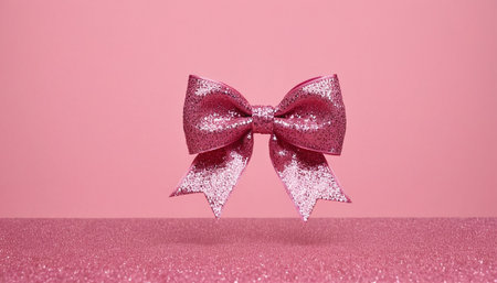 Glittering pink ribbon bow sits on a soft surface with blurred lights, ideal for gift wrapping, celebrations, and festive decor themes. Generated A.I.