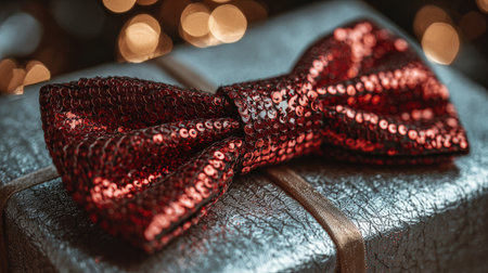 A close-up image of a shiny red sequined bow resting on a glittery gift box, beautifully complemented by a soft bokeh of warm lights in the background.