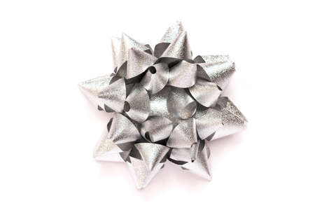 Beautiful silver gift bow christmas decoration isolated on white background. Xmas ornaments with copy space for text. New year realistic decor design element for celebrate card or flyer winter holiday