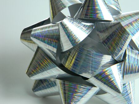 a close up of a christmas gift bow. It is silver with many color highlights shining