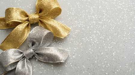 Dazzling gold and silver bows shine against a sparkling gray background, perfect for adding elegance to any gift or celebration. Ideal for festive occasions!