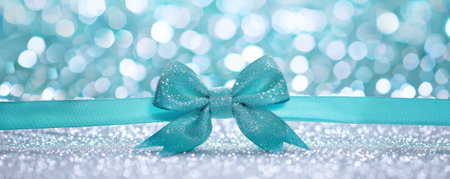 A bright turquoise ribbon bow on a white glitter background. The vibrant color and sparkling texture create a lively and modern look.