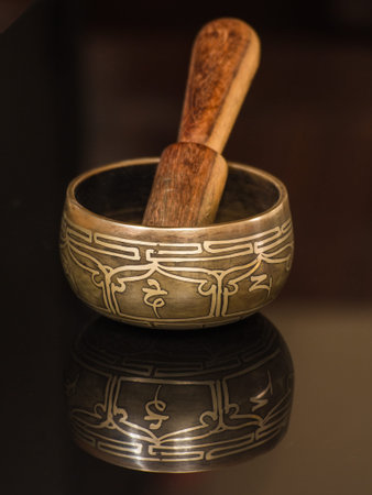 Close-up of a Tibetan singing bowl in your hands - Translation of mantras: transform your impure body, speech and mind into a pure exalted body, speech and mind of a Buddha.