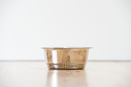 Empty cats steel bowl on wooden floor. Lot of copyspace. Crisis or pet diet concept horizontal