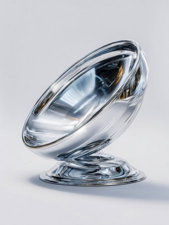 A sleek, reflective metal sculpture sits elegantly on a dark surface, illuminated softly by natural light.