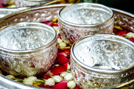 silver bowl with flower petals floating on the surface, used for decorative Asian style or in Songkran festival