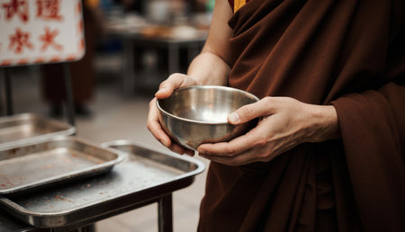 A monk stands quietly holding a metal bowl in both hands amidst a lively urban setting. The scene is filled with the sounds and sights of city life, showcasing a blend of tradition and modernity.